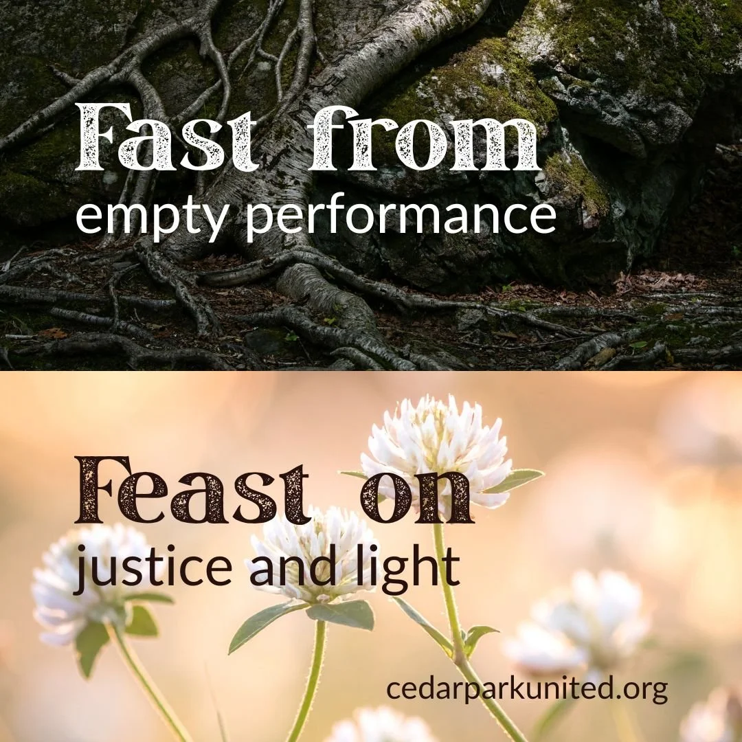 This year, we engage this practice during an in-between time in the life of Cedar Park United. We are accompanied by our pastoral minister Jessica Gauthier as we prepare to welcome Michael Caveney as our lead minister on July 1. In moments of transition, the church often finds itself returning to what it already holds. In 2019, Elisabeth Jones led Cedar Park United in a Lenten practice of fasting and feasting shaped by Scripture, justice, and hope, inspired by a poem/litany written by American pastor William A. Ward (1921-1994). This calendar draws from that treasure—not as repetition, but as renewal.